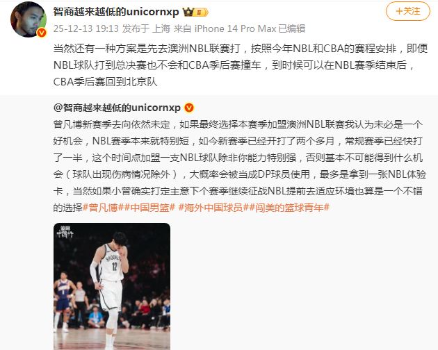 对此,媒体人王健给出建议表示:“曾凡博新赛季去向依然未定,如果最终选择本赛季加盟澳洲NBL联赛,我认为未必是一个好机会。NBL赛季本来就特别短,如今新赛季已经开打两个多月,常规赛季已经快打一半,这个时间点加盟一支NBL球队,除非你能力特别强,否则基本不可能得到什么机会(球队出现伤病情况除外),大概率会被当成DP球员使用,最多是拿到一张NBL体验卡,当然如果小曾确实打定主意,下个赛季继续征战NBL,提前去适应环境也算是一个不错的选择。”