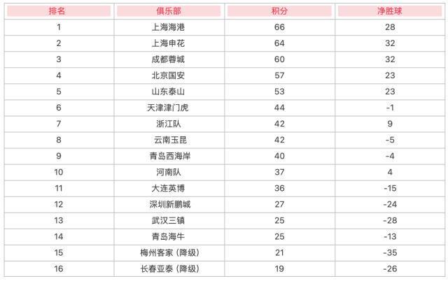 中超30轮积分榜:海港积66分夺冠梅州亚泰降级